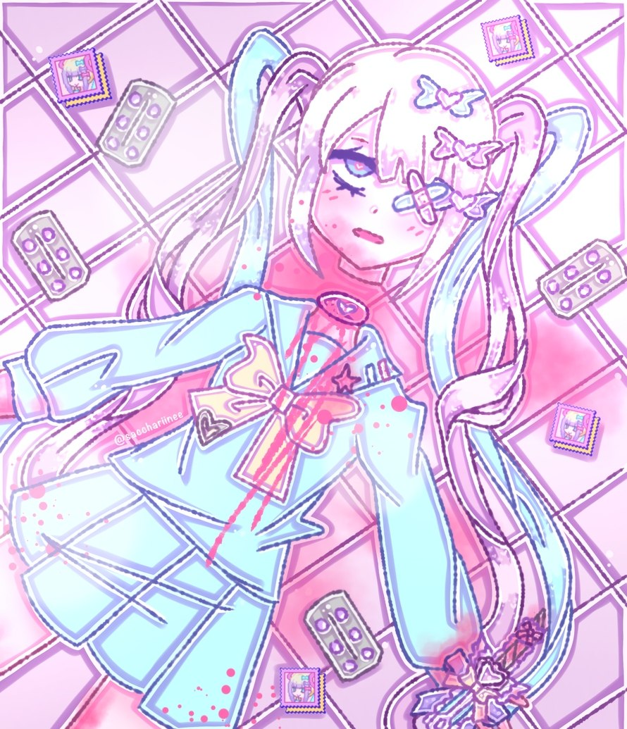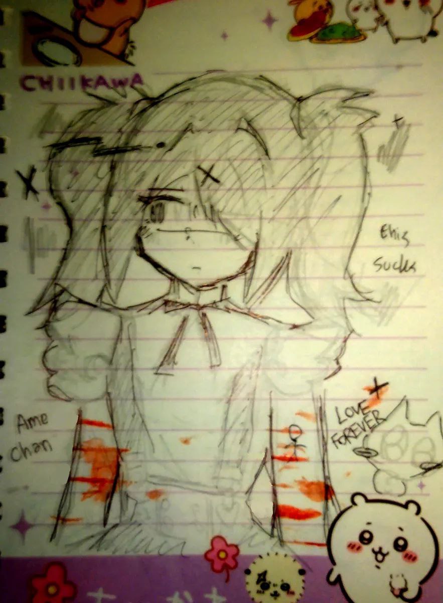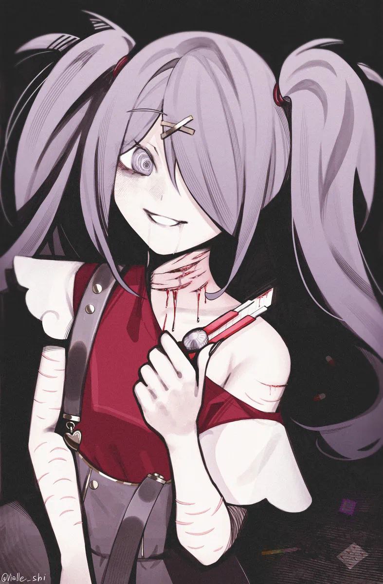 boycutter; the white cat, holding a red box cutter in the aftermath of cutting himself. there are cuts on his wrists, shoulders, and cheeks, the ones on his cheeks resembling blush lines. he looks at the box cutter and his bloody paws with a conflicted look on his face. there are blood spills in the background, one splat being in the shape of a heart.